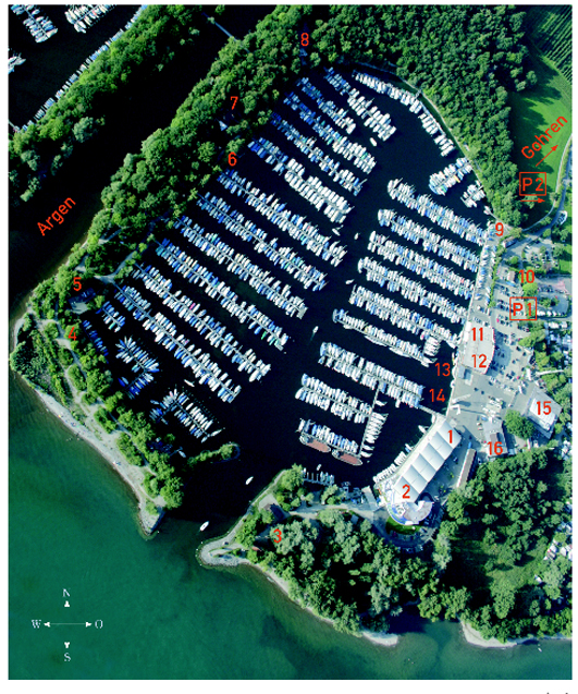 Geradeaus weiterfahren bis links Parkplätze kommen. Dort bitte parken und dann einen schönen Spaziergang oder fröhliches Radeln rechts um den Hafen herum. Ganz hinten rechts liegt dann das Clubhaus der Kressbronner Segler.